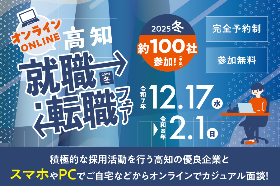 本年も「オンライン高知就職・転職フェア2025冬」へ出展致します。 高知県での就職をご希望の求職者の皆様、2027年卒業予定の皆様におかれましては、今回の説明会で企業と面談を行うことが出来ます。 参加された方におかれましては、面談以降、企業訪問や採用面接等で高知県へ訪問する場合、条件に該当する場合に交通費や宿泊費の助成を受けることも可能です。 まずは画像からイベントページをご確認いただき、参加のお申し込みをお願い致します。 多数のご参加をお待ちしております!